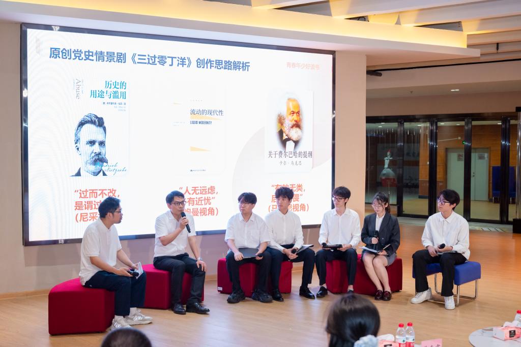 学生代表率先诵读《恰同学少年》片段,以饱满的情感重现了毛泽东等革命青年的热血岁月,引导大家思考历史与现实的联系,当代青年的责任与担当。杨楠老师诵读《日出》片段,用富有感染力的声音展现出剧中的社会百态、人性挣扎;王庆坤、赵泽岚两位老师携手演绎《暗恋桃花源》片段,让观众沉浸于经典的魅力。在对谈分享时,李科老师与三位老师围绕剧本创作背景、角色塑造心得等进行深入交流,为学生们带来深刻的戏剧解读。原创党史情景剧《三过零丁洋》片段的围读将活动推向高潮。学生演员们的精彩诵读,生动展现了那段波澜壮阔的历史。党委副书记、纪委书记蔡东宝与学生演员在对谈中,分享了作品的创作历程与教育意义,将哲学智慧融入剧本的巧思,引导学生感悟红色革命文化。