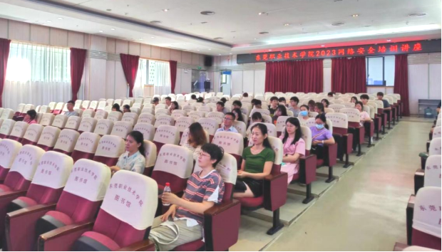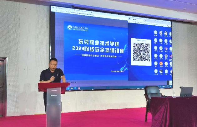 为深入贯彻落实习近平总书记关于国家网络安全的重要指示精神,全面落实东莞市网信办和教育局关于“莞盾2023网络安全攻防演练”的工作要求,6月20日下午,学校信息与教育技术中心特邀深信服科技股份有限公司网络安全讲师高晗,在图书馆2楼学术报告厅开展了主题为“增强网络安全意识,筑牢网络安全防线”的培训讲座,共有全校各部门师生66人到场参加。